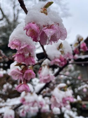 東京でも雪が降った先週末。娘と一緒に雪が舞い落ちるなか、近所の緑道に雪景色を見に散歩に出かけました。前日までのびのびと咲いていた梅や椿や様々な花たちは、すっかり雪に覆い被されていました。雪の重みとつららまであったりと寒そうで可哀想だけど、なかなかお目にかかれない光景です。そういえば、前回は2020年3月29日。その時は満開の桜が雪に埋まってしまい、とても幻想的だったのを思い出しました。雪もおさまってきた…