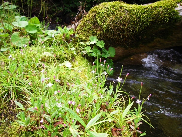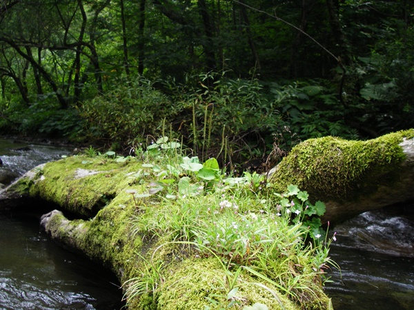 静かに流れる景色の中に、倒木に苔が生え、そこにいくつかの草花の種をつけて育ったのでしょう、薄桃色の小さな花が、ひんやりとした川の中でひときわ輝いています。