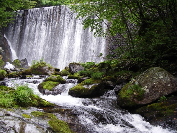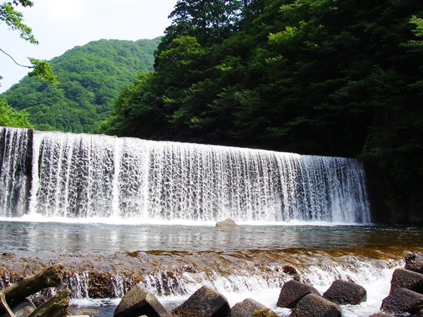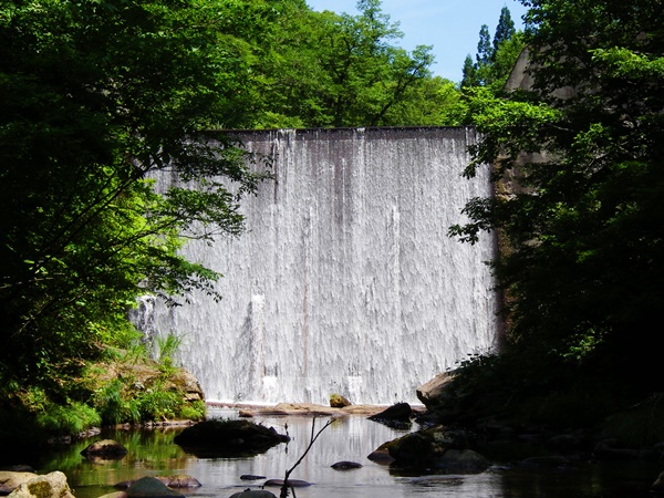 堰堤から落ちる水の勢いによってしぶきがあがり、マイナスイオンを体感できます。