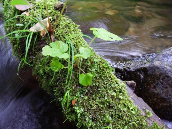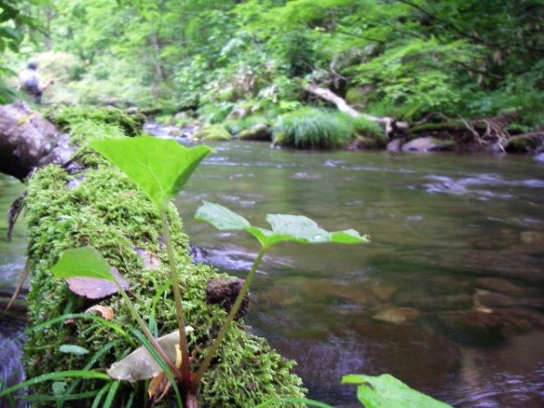 川のほとりへ下りると、流木に付いた苔からフキやシダなどの植物が程よい