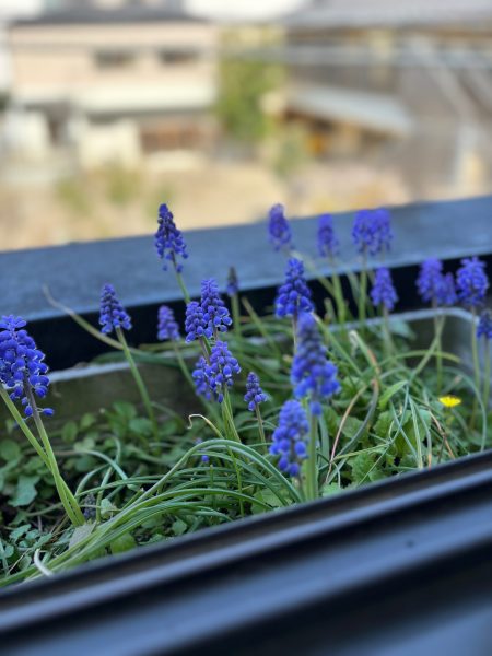 グレープヒヤシンス という英名がついているように、よく見るとベル型の小さな花がたくさんつくその形状はまるでブドウの房のよう。